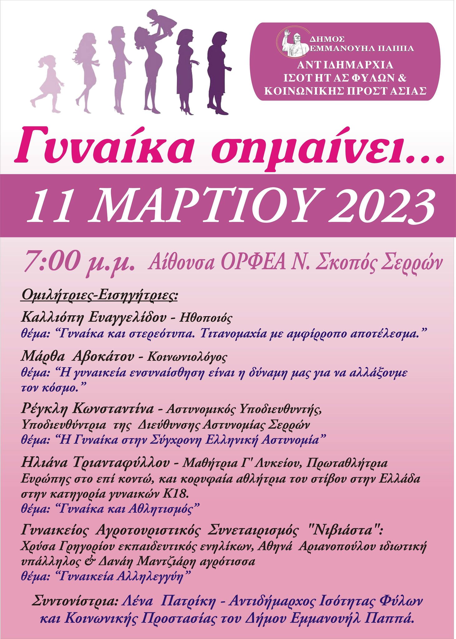 ΕΚΔΗΛΩΣΗ ΓΙΑ ΤΟΝ ΕΟΡΤΑΣΜΟ ΓΙΑ ΤΗΝ «ΗΜΕΡΑ ΤΗΣ ΓΥΝΑΙΚΑΣ», ΤΟ ΣΑΒΒΑΤΟ 11-03-2023.