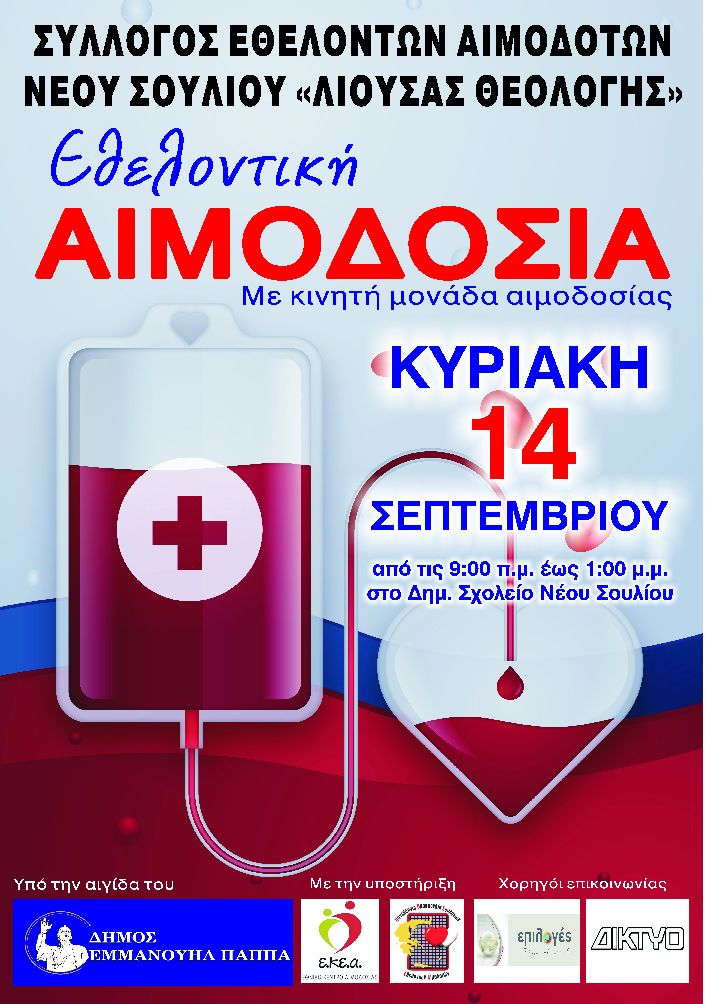 Σεπτέμβριος 11, 2025 12:11 μμ Αφήστε σχόλιοΤην Κυριακή 14 Σεπτεμβρίου 2025, θα πραγματοποιηθεί εθελοντική αιμοδοσία στη Δ.Κ. Νέου Σουλίου του Δήμου Εμμανουήλ Παππά. Η κινητή μονάδα αιμοδοσίας θα βρίσκεται στο Δημοτικό Σχολείο Νέου Σουλίου από τις 9:00 έως και τις 13:00.