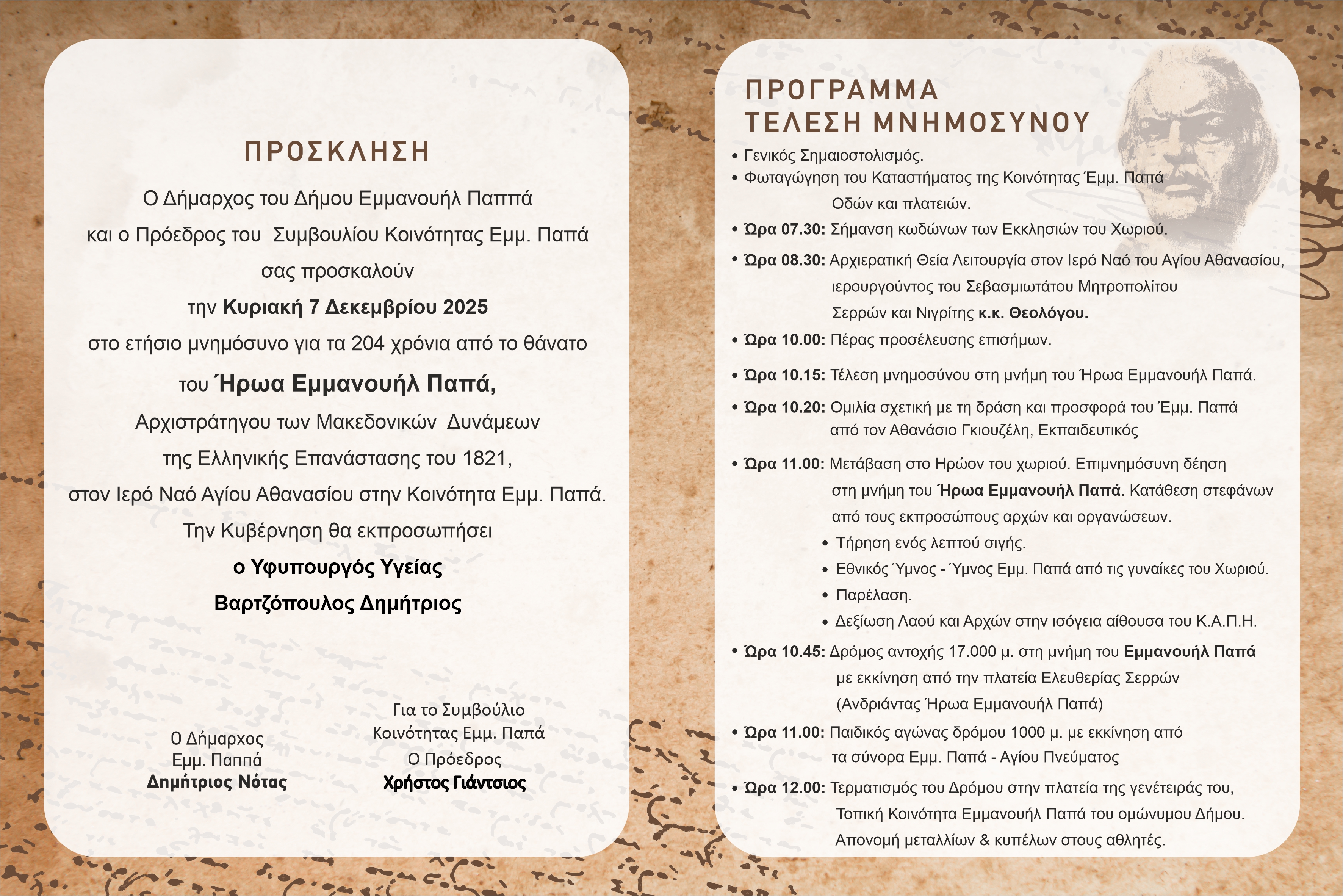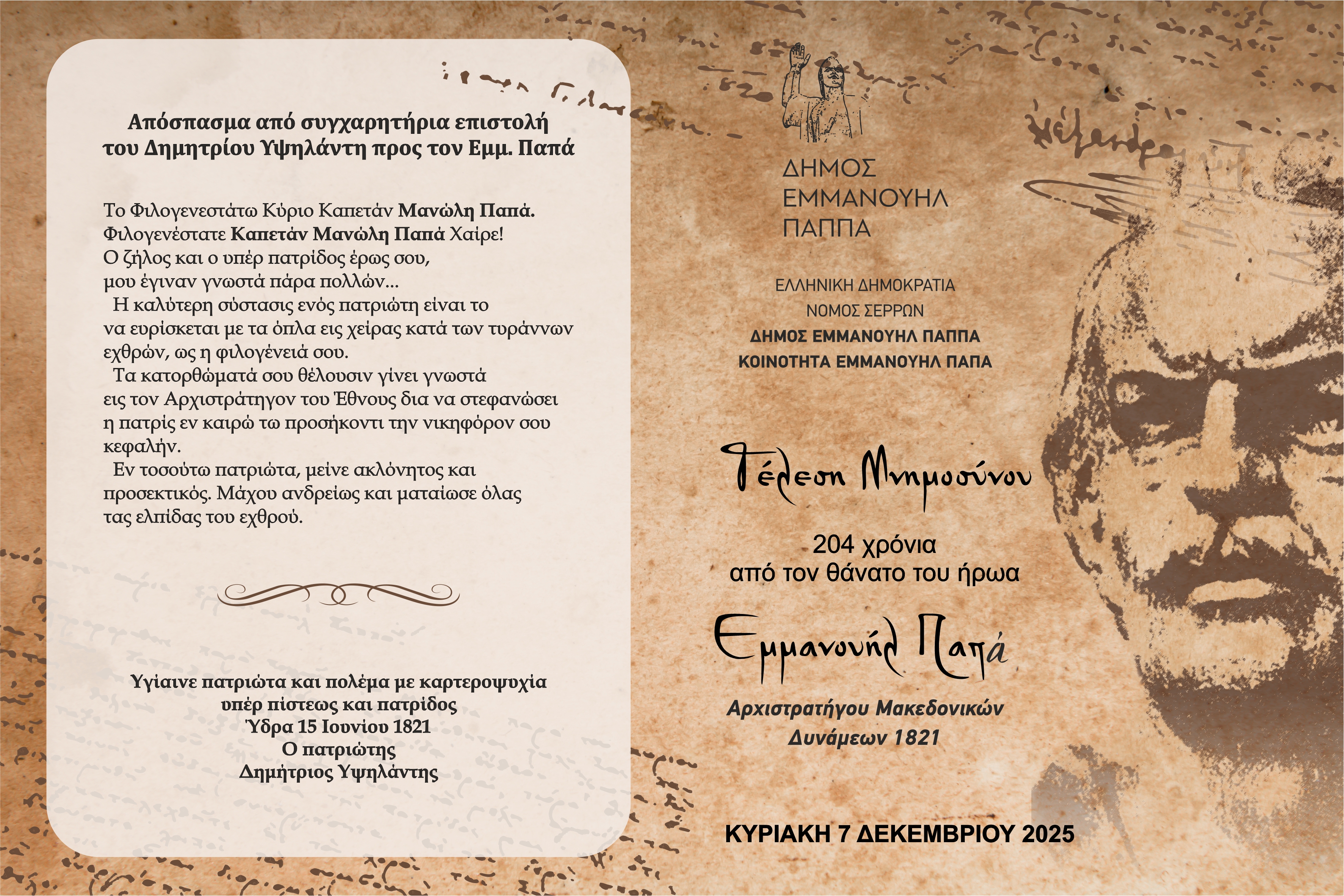 Δεκέμβριος 4, 2025 1:20 μμ Αφήστε σχόλιοΟ Δήμος Εμμανουήλ Παππά και ο Πρόεδρος του Συμβουλίου της Κοινότητας Εμμανουήλ Παπά, σας προσκαλούν την Κυριακή 7 Δεκεμβρίου 2025, στο ετήσιο μνημόσυνο για τα 204 χρόνια από τον θάνατο του Ήρωα Εμμανουήλ Παπά Αρχιστράτηγου των Μακεδονικών Δυνάμεων της Ελληνικής Επανάστασης του 1821, στον Ιερό Ναό Αγίου Αθανασίου στην Κοινότητα Εμμ. Παππά.